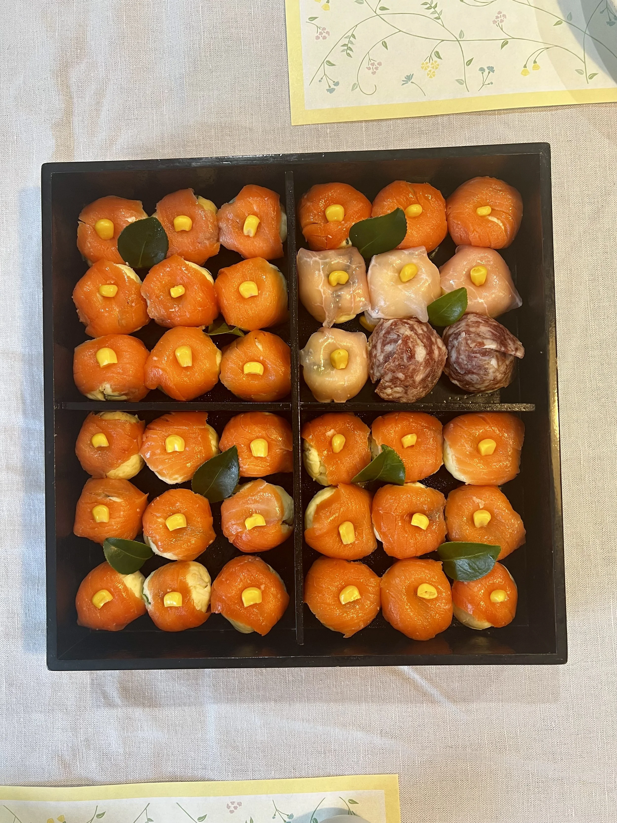 After a few days though, I will be honest. You start wanting something a little different. That is when small, personal twists appear. In our home, we have been adding a dish we call Tsubaki /camellia Salad for decades. Potato salad topped with smoked salmon, shaped like a camellia flower. It is not traditional, but it has become tradition for us. Osechi slowly evolves like that, family by family.