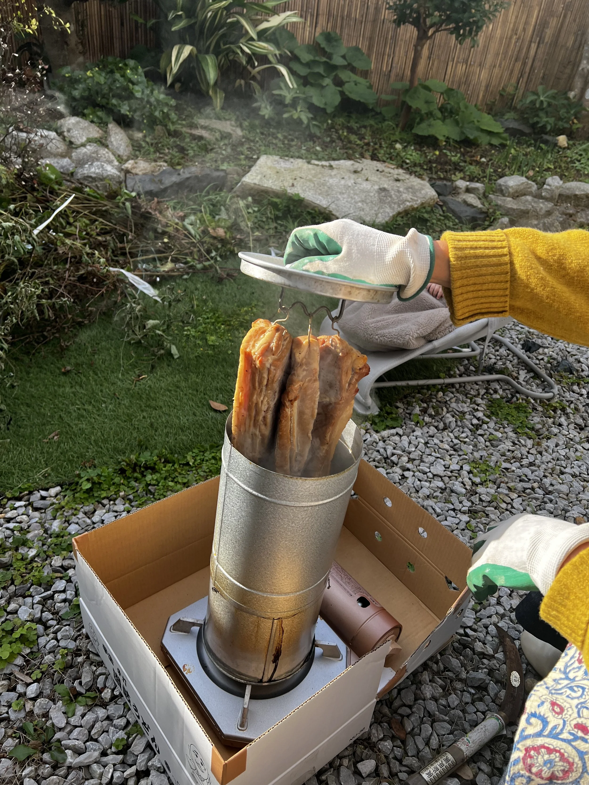 The process takes two full weeks: pork belly is salted, soaked in a sweet brine, dried, and finally smoked in our garden 🌿🔥. The smell fills the house, sticks to your clothes, and instantly makes you feel like you’re at a cozy campsite 🏕️.