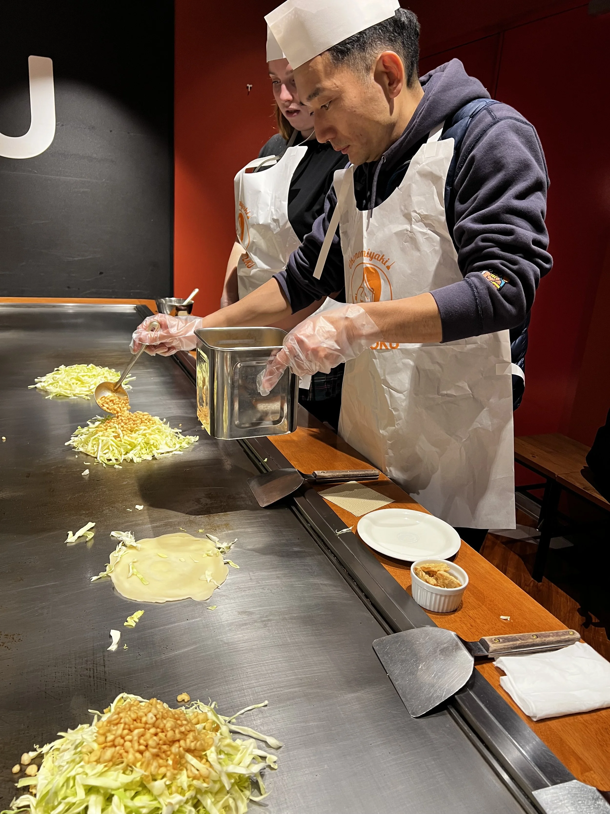 Because I run cooking classes for international guests, I joined an okonomiyaki cooking experience run by a major Hiroshima sauce company. It was designed entirely for foreigners. We were the only Japanese participant, plus one other foreign guest, which made us look very suspicious. Why are you here. Who are you working for. Light spy vibes.