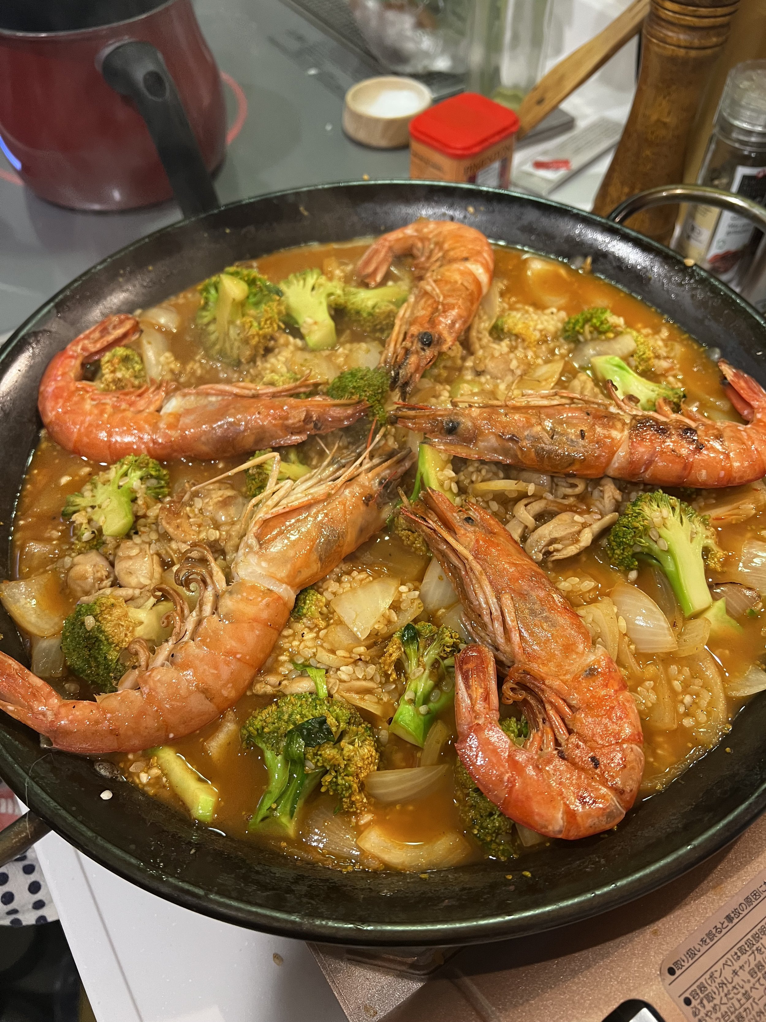 That “wrong” version—the one overflowing with seafood—is exactly the paella I crave. Recently, I cooked paella at home with my sister under her instruction, who’s married to a Spanish. In Japan, paella can easily drift toward something like takikomi gohan, cooked rice with many ingredients, which is comforting, but not what I’m aiming for.